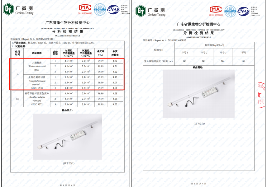 紫外光源第三方檢測(cè)報(bào)告:(輻照強(qiáng)度+殺菌率)